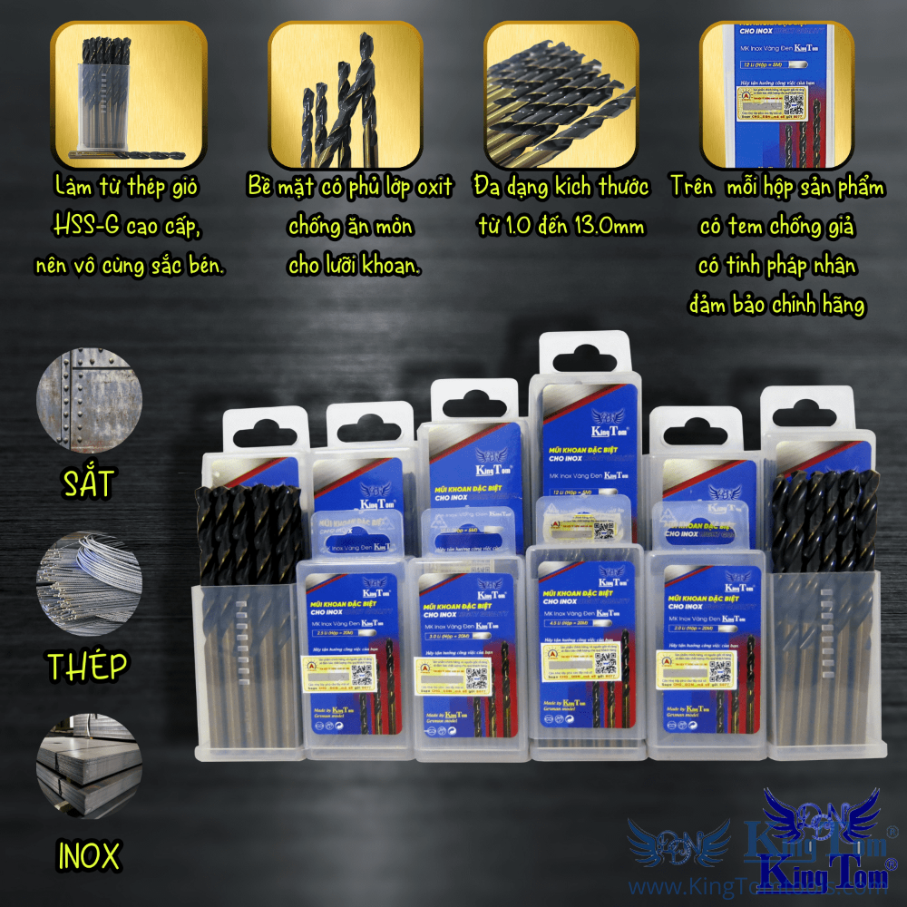 Mũi khoan Inox KingTom Vàng Đen KingTom được sản xuất từ thép HSS cao cấp siêu cứng với công nghệ hiện đại tiêu chuẩn của Đức nên mũi siêu cứng, sắc bén và có khả năng chịu nhiệt tốt trong môi trường khoan liên tục.