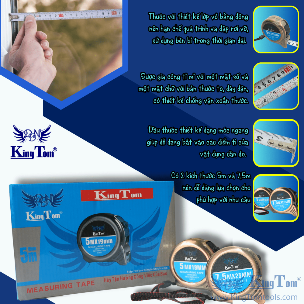 Đầu thước thiết kế dạng móc ngang, dễ bắt vào các điểm tì của vật dụng cần đo, đặc biệt còn khắc logo KingTom tạo điểm nhấn cho sản phẩm.